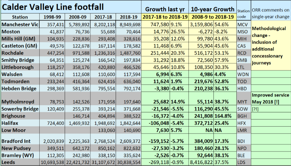 Our table adapts the ORR’s spreadsheet. Explore link above for national picture. Interpretation may require a pinch of salt. Nobody’s been counting actual passengers: figures estimate total entrances and exits from ticket sales, with adjustments for multimodal tickets like MCard. Note comment on methodology for the GM stations, where free concessionary travel has been evaluated and included for the first time. So apparent surge over the border is journeys suddenly being counted and high growth compared with the Yorkshire side is more apparent than real. It is right to include these journeys and the comparison will again become valid in future results.